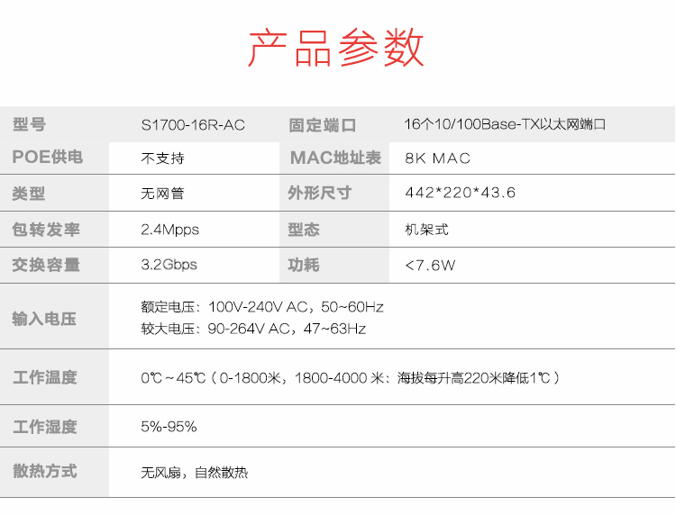 • 交换机网络标准: 16口百兆以太网交换机