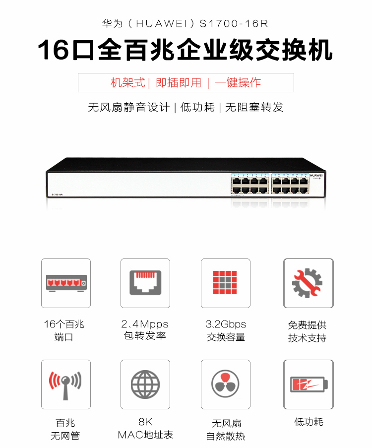 • 商品名称: 华为(HUAWEI)-交换机-S1700-16R-AC 16口全百兆非网管 交换机
