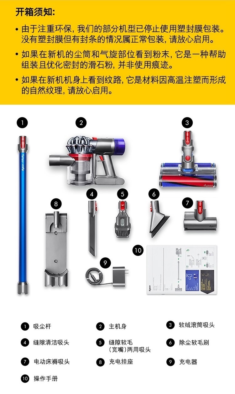 主机×1、操作手册×1、挂壁式充电底座×1、充电器×1、软绒滚筒吸头×1、缝隙软毛(宽嘴)两用吸头×1、缝隙清洁吸头×1、电动床褥吸头×1、除尘软毛刷×1 |