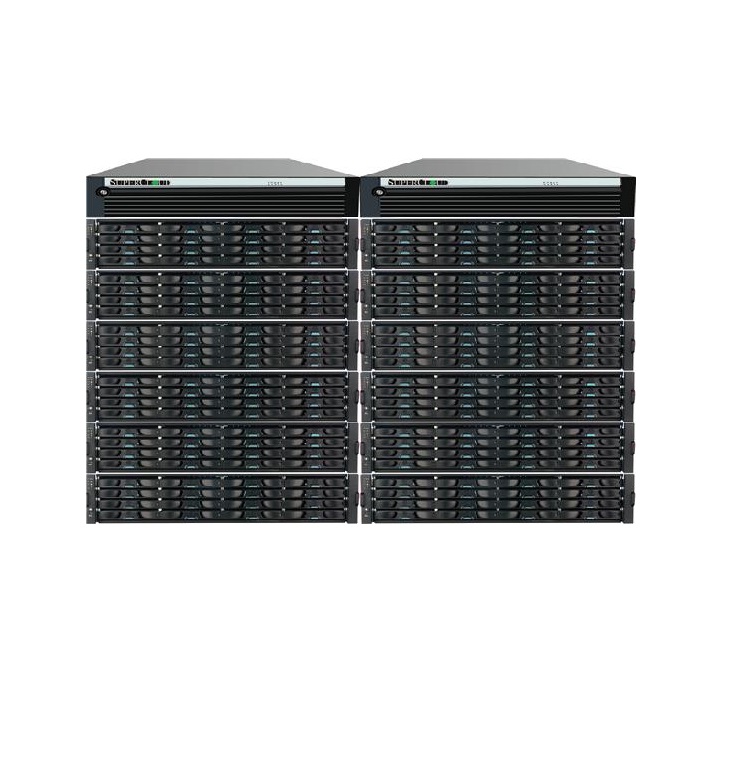 其他特性 | SuperCloud XS5000集群统一存储主控单元(4U/36Bay) 1. 集群统一存储同时支持NAS (NFS, CIFS WebDAV, FTP) 、IP-SAN、FC-SAN、以及对象存储,支持Amazon S3及OpenStack SWIFT云存储接口,单集群最多可扩展至256个节点; 2. 每节点配置2颗64位处理器,缓存最大可扩展至512GB高速缓存; 3. 每节点标配8x1GbE主机通道(4x内网,4x外网),支持LACP链路聚合,提供4个I/O扩展槽,可扩展双口或四口1GbE主机通道扩展模块、双口10GbE主机通道扩展模块以及双口8Gb FC主机通道扩展模块; 4. 每节点4U规格,36个3.5"硬盘槽位; 5. 支持SAS/SATA/SSD磁盘,内建SSD缓存加速,支持数据分层;标配2x160GB SSD缓存; 6. 内建存储虚拟化,可管理外接磁盘阵列; 7. 单集群可管理超过128PB容量; 8. 支持 4096 个 iSCSI Target; 9. 支持在同一命名空间中存储超过 10 亿个文件; 10. 单一卷 支持 1024 个以上快照; 11. 内建精简配置,支持数据压缩及去重; 12. 支持RAID级别0,1,5,6,50,60; 13. 内建本地复制(可选2-10份副本)及异地复制; 14. 内建存储QoS功能。 |