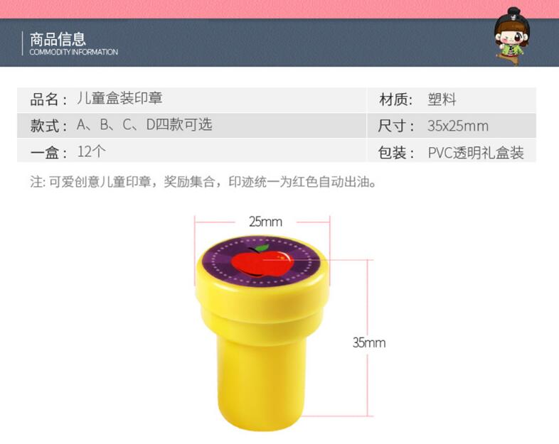 • 型号: 儿童印章 儿童幼儿园宝宝礼物奖励鼓励印章可爱卡通玩具图章盖章圆印章形防水图章 D款12个盒装